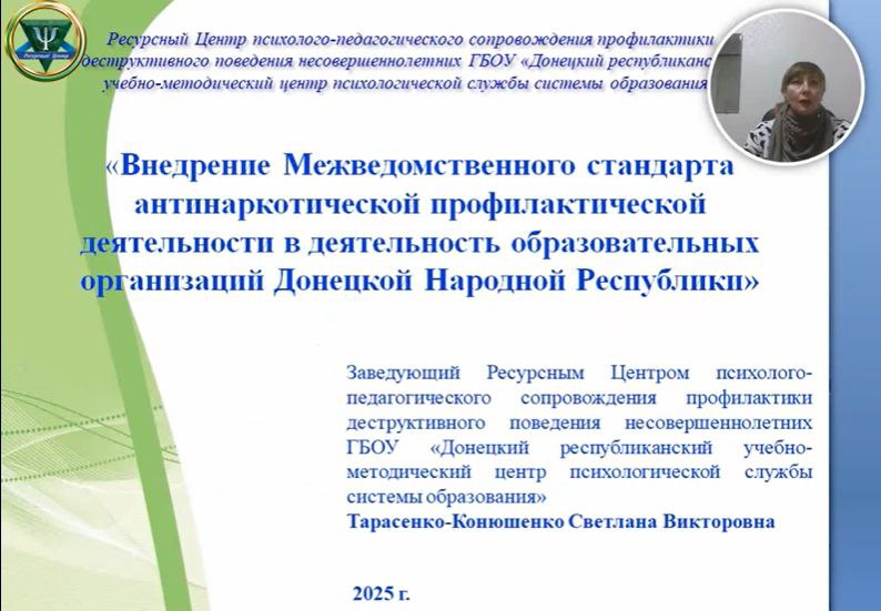 15 октября 2025 года на базе ГБОУ «Донецкий республиканский учебно-методический центр психологической службы системы образования» был проведен обучающий вебинар «Внедрение Межведомственного стандарта антинаркотической профилактической деятельности в деятельность обр